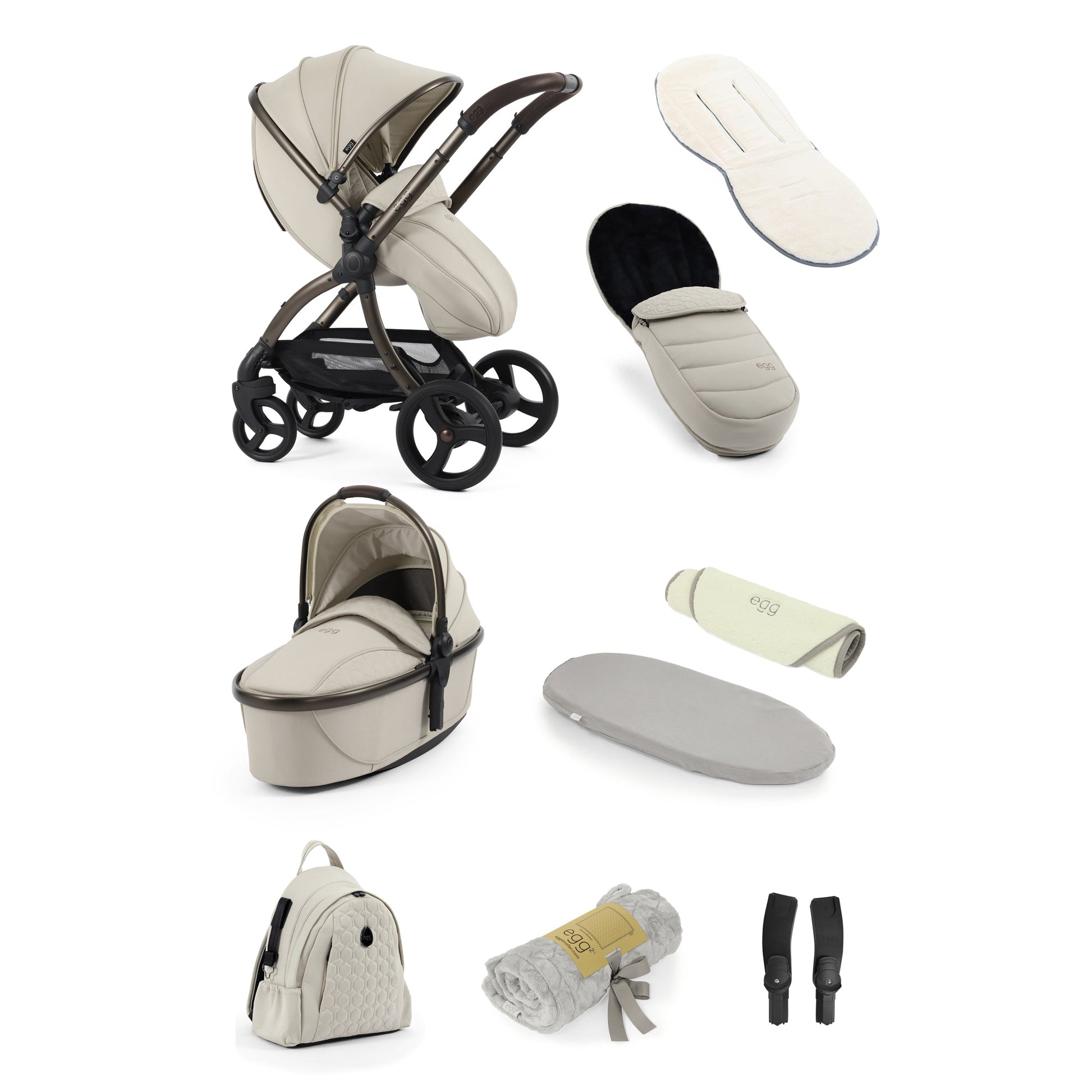 The egg3 9 Piece Snuggle Bundle in Cashmere signature soft-touch marl fabrics dress the classic egg3® gunmetal chassis, while the black hand-stitched handle and bumper bar adds depth of contrast to complete the whole aesthetic.