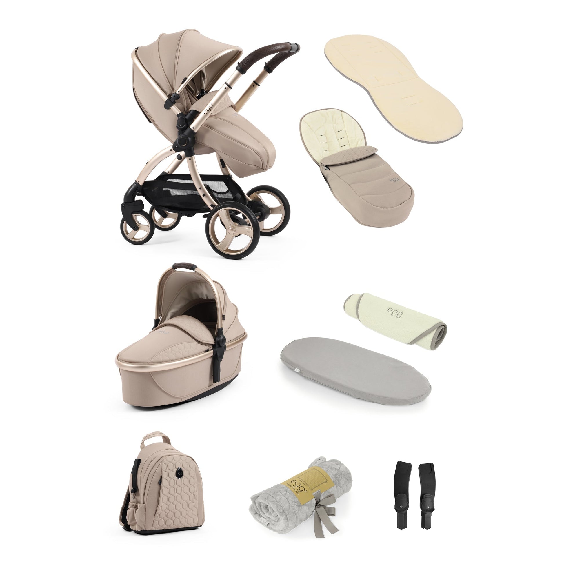 The egg3 9 Piece Snuggle Bundle in Feather soft-touch tailored marl fabrics delicately dress an elegant champagne chassis, whilst a luxury hand-stitched handle and bumper bar in rich chocolate brown perforation and traditional egg® signatures finish Feather with class.